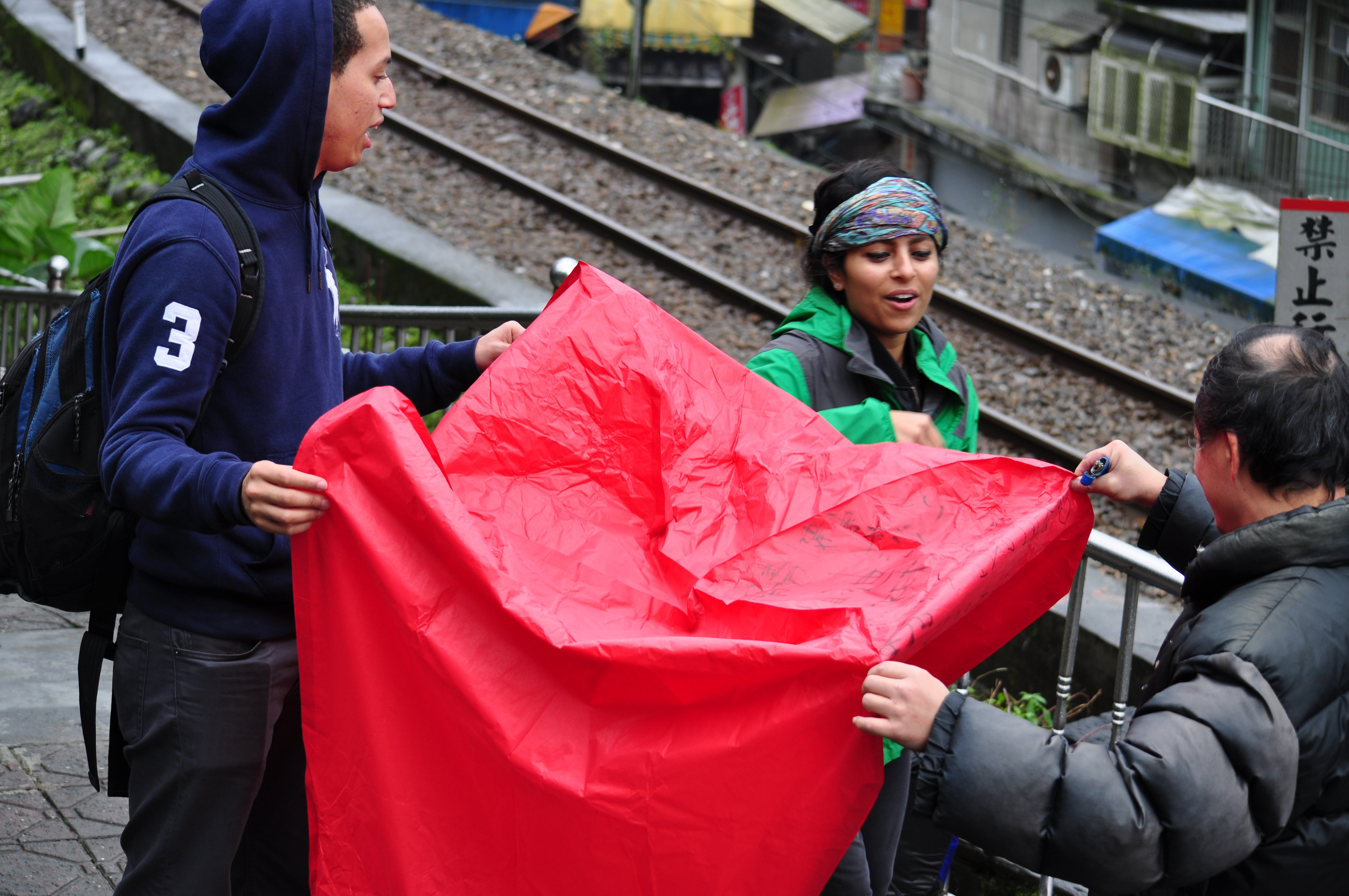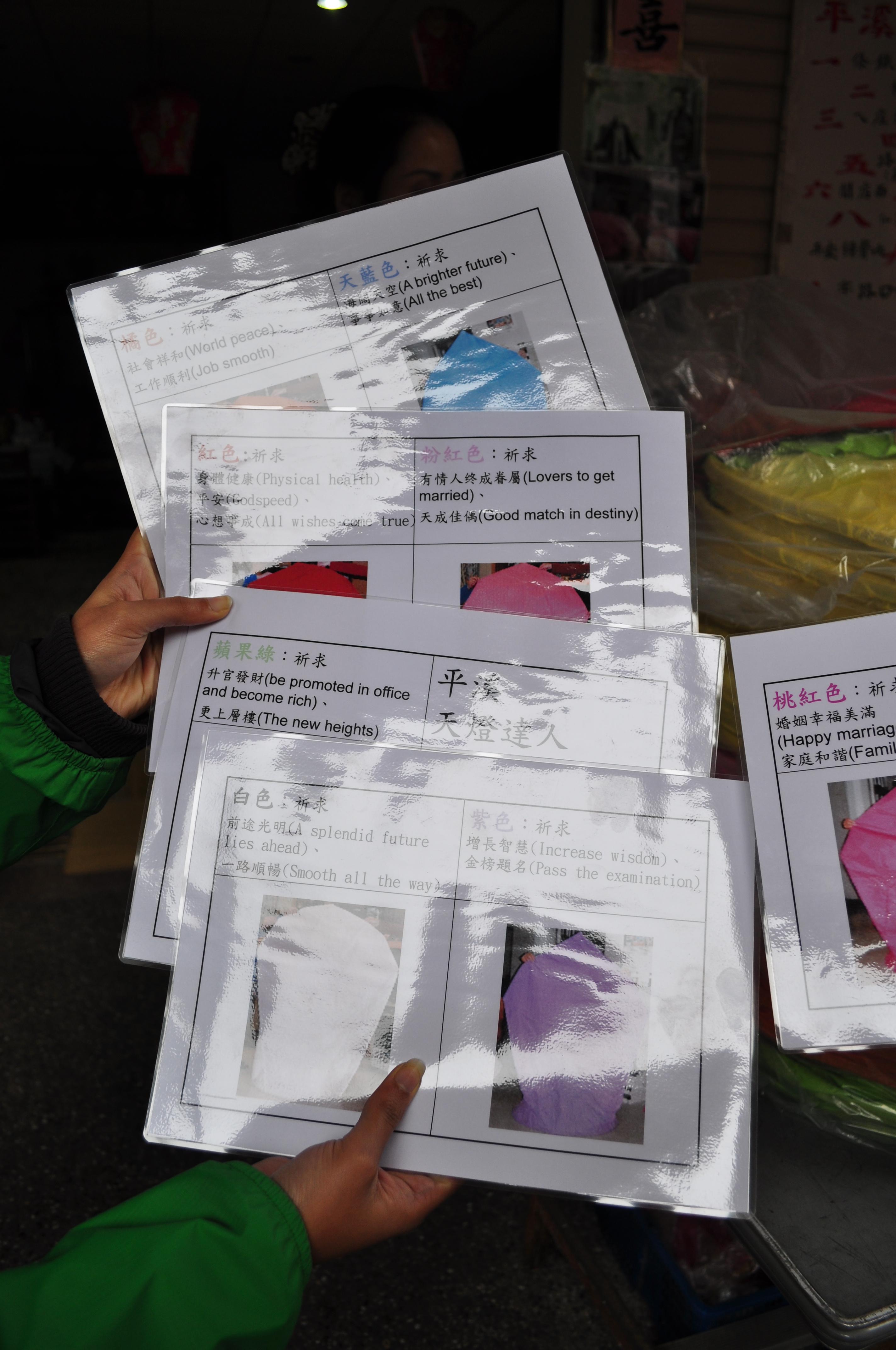 You can buy lanterns in many different colors, representing the type of wish you would like to make. Some are one solid color, while others have multi-colored panels to take care of many wishes with the same balloon. Lucky for us, in Pingxi, you don’t have to wait for the festival–you can send up a lantern any day of the year!