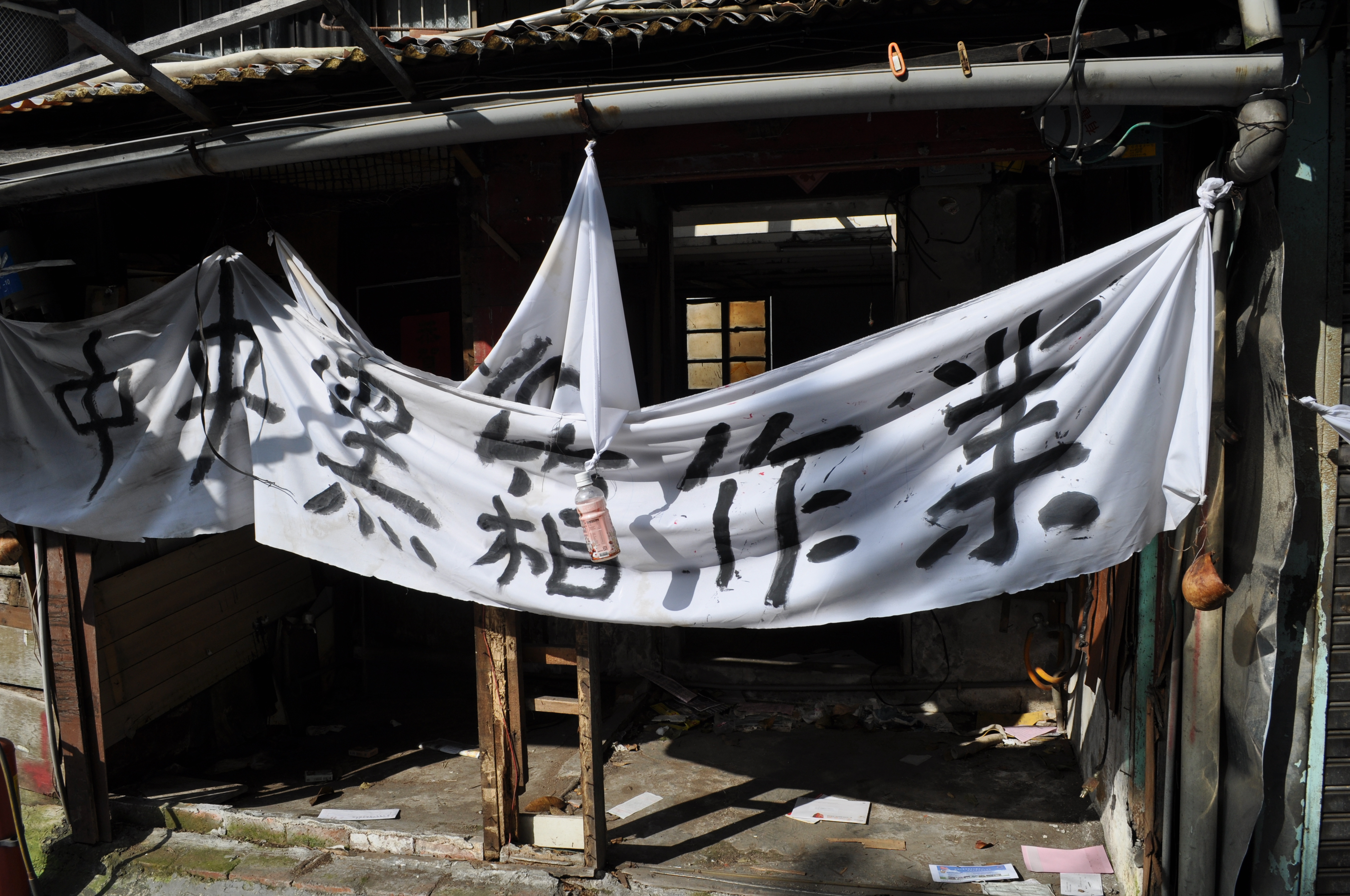 banners line jinhua street telling taipei what is going on in huaguang. what used to be a row of shops now only has one beef noodles shop open for business/huaguang community, taipei/feb 3, 2013