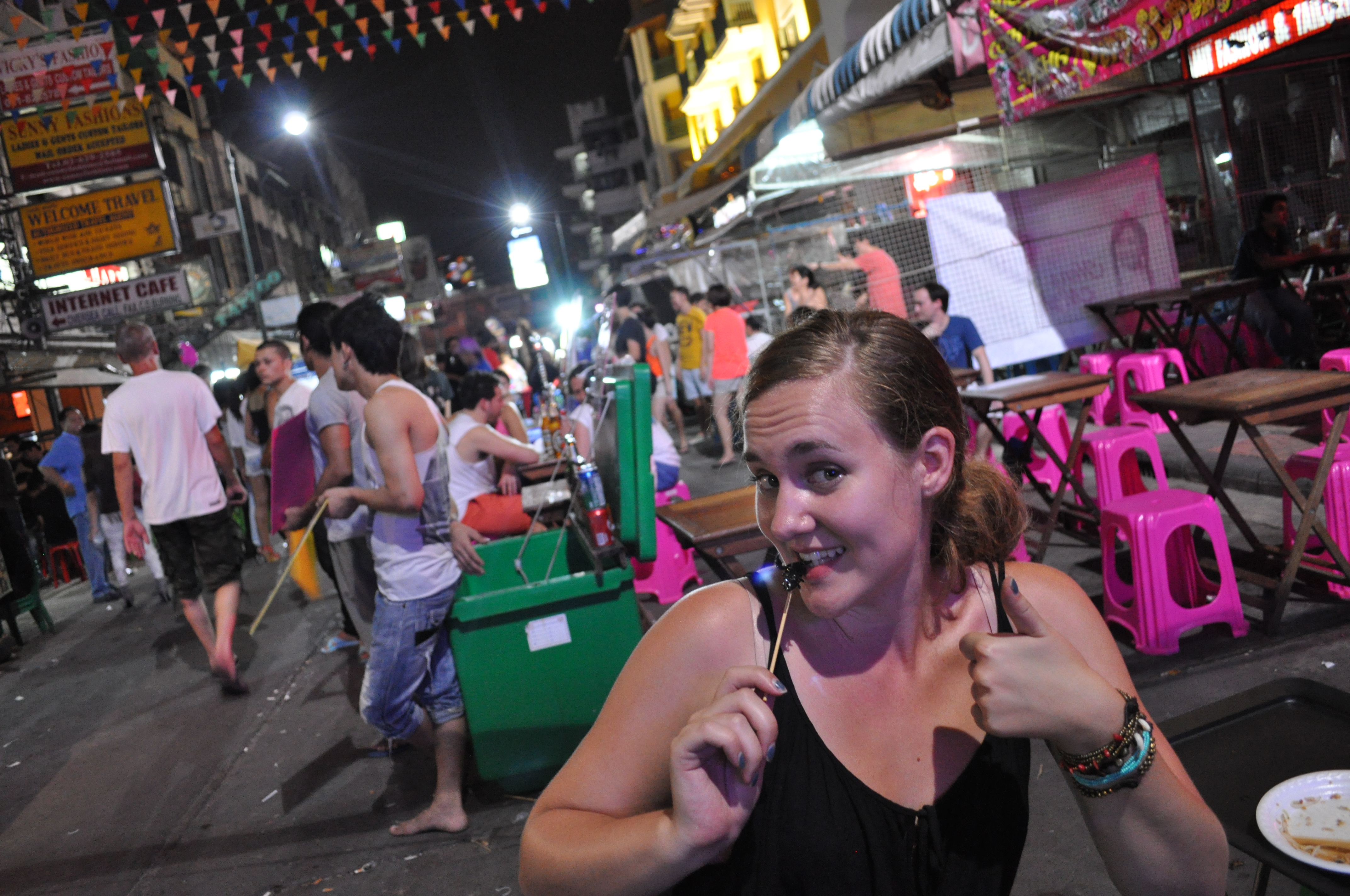 As it does for most travelers, enjoying the delicious foods of Thailand came with a price. + on our last night, Christian was too sick to go out. With her permission to get out of the hotel room (thanks, C!), I hung out with Jimmy + some of his buddies who showed me how to properly get down on Khao San Road: fried scorpions, buckets, pad thai, hookah + all.