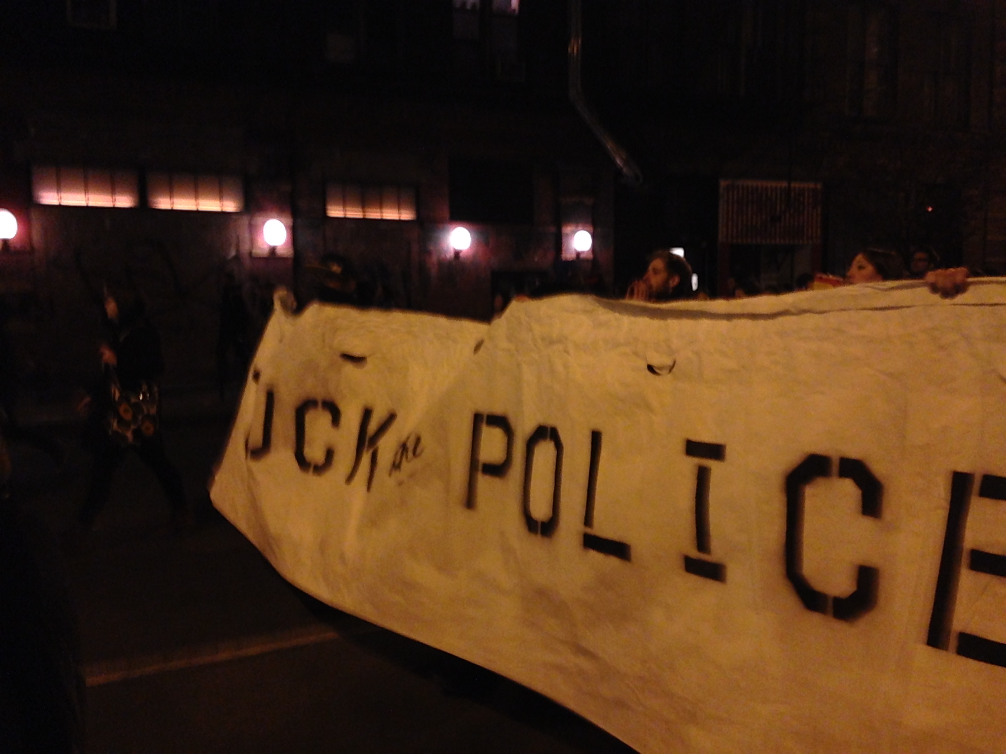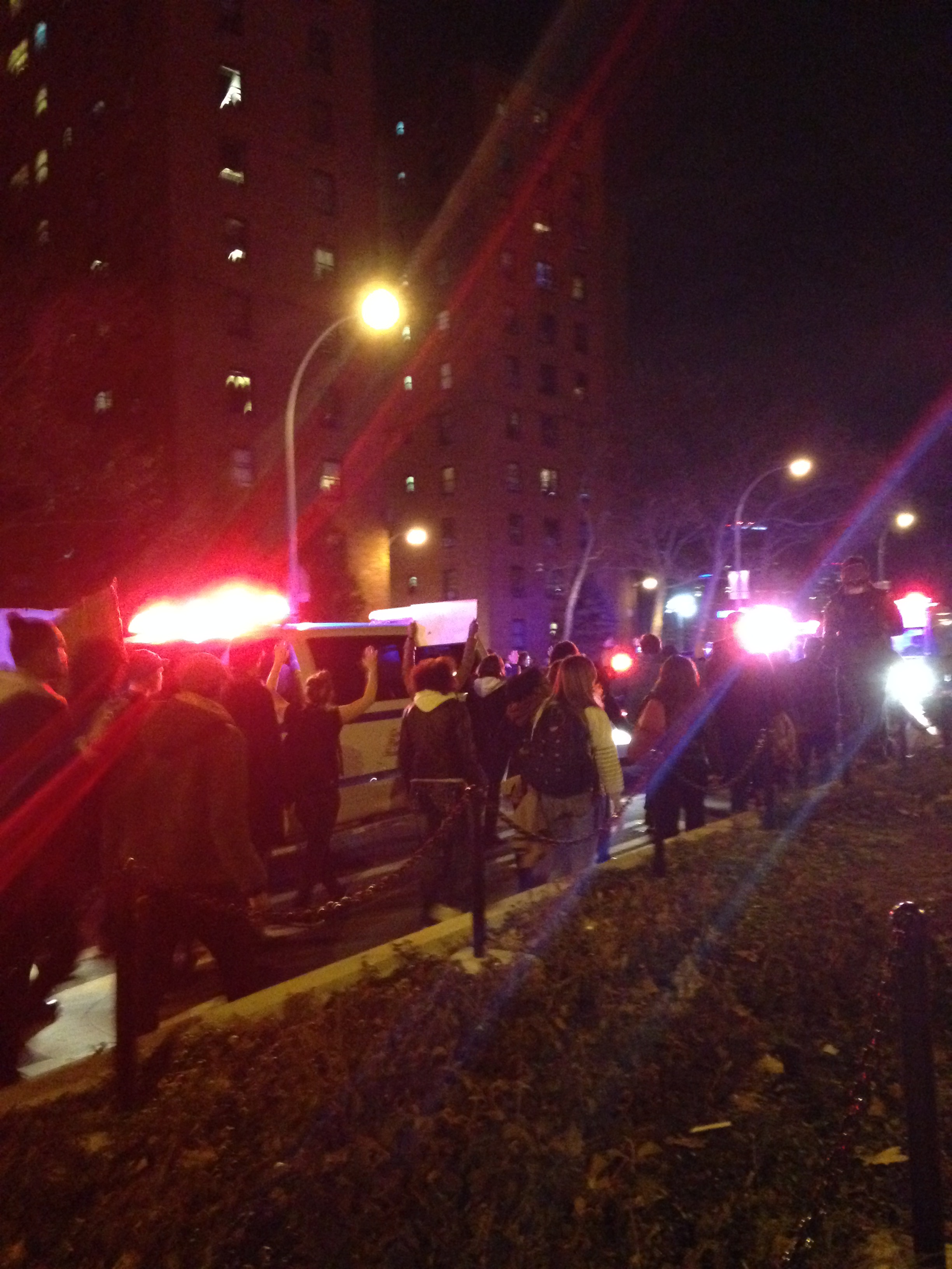 Last night, while I was having a drink with my boyfriend at my parents’ apartment, a group of protesters appeared, marching and chanting down Sixth Avenue. That was all the invitation I needed. I grabbed Jason’s hand and we joined. We marched down Sixth Avenue, over Houston Street and onto the FDR up to the UN–where we turned off–leaving a group of thousands continuing up First Avenue.