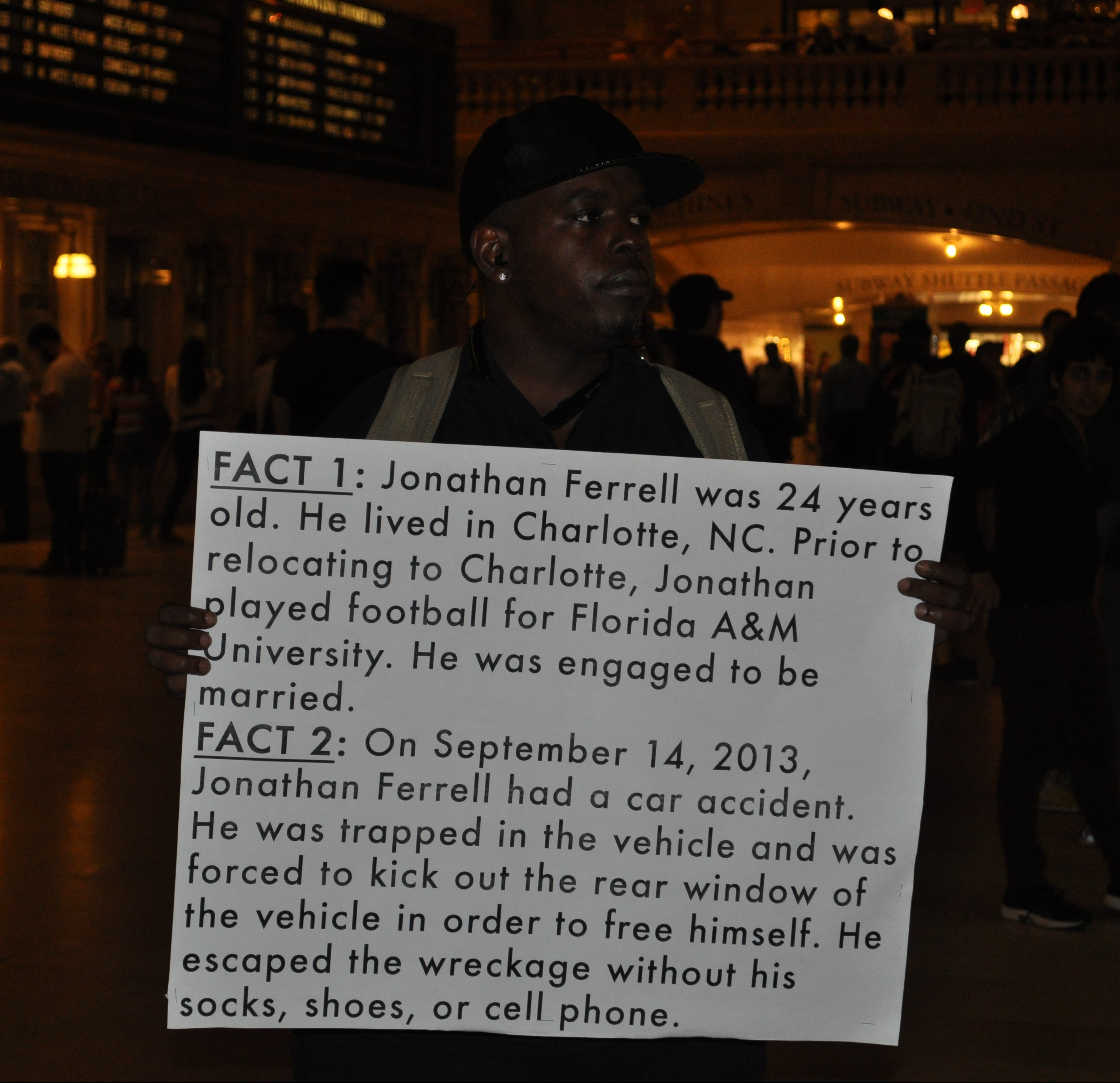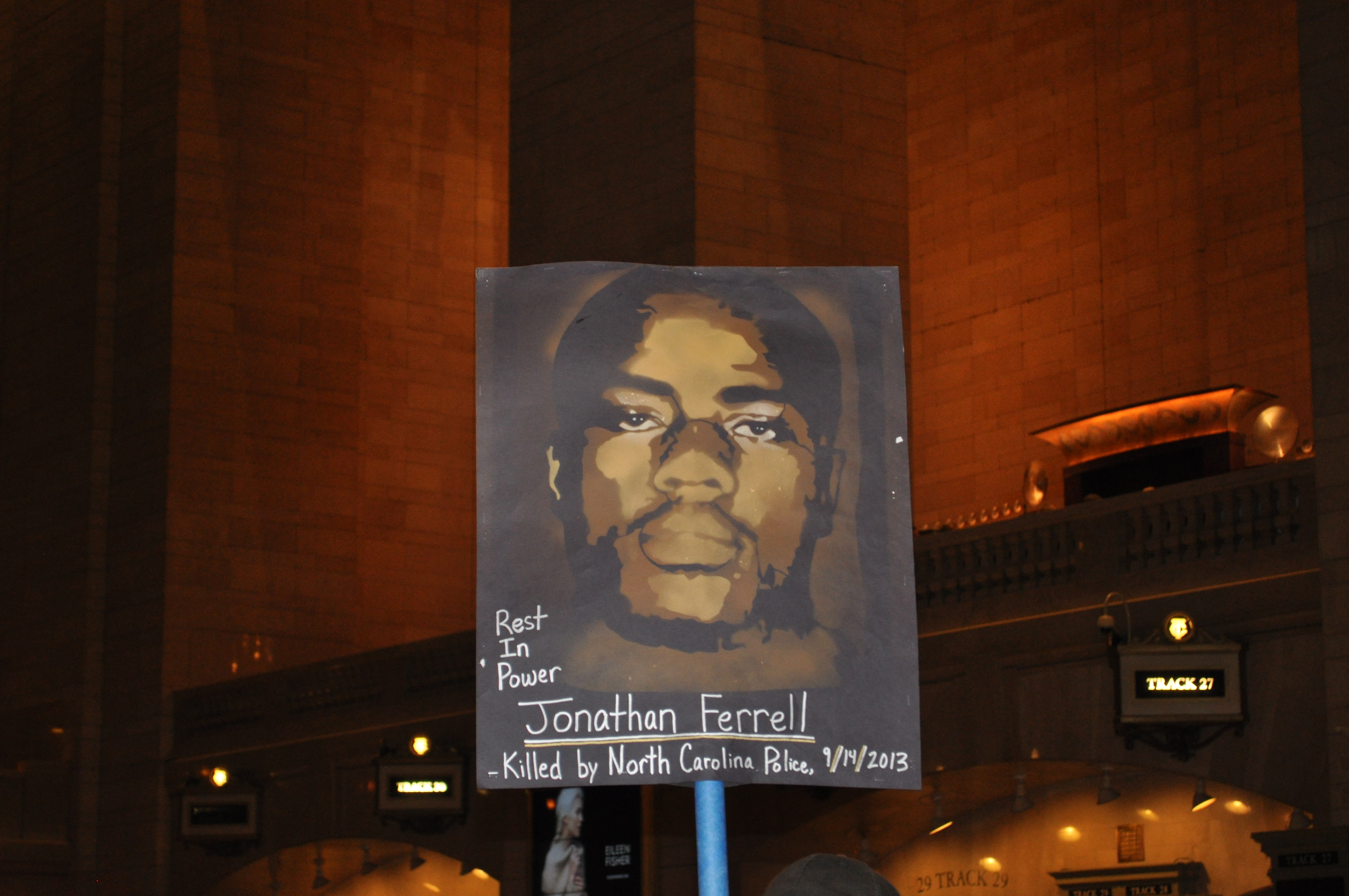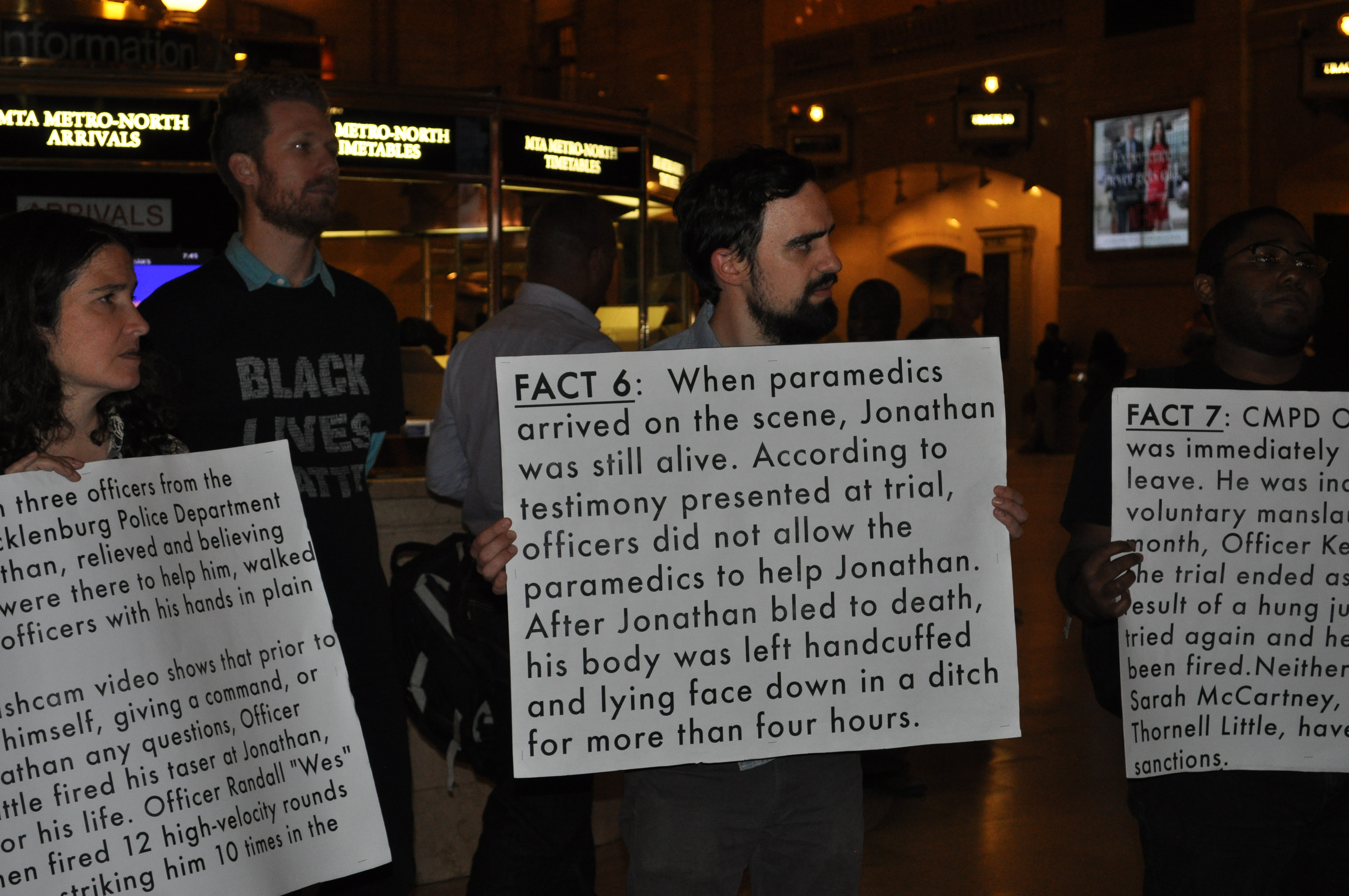 Last week I went to my first Peoples Monday, a weekly Call to Action with Black Lives Matter NYC and Shut It Down NYC. The photos in this post are from last week’s event for Jonathan Ferrell. He was murdered by cops in North Carolina two years ago. You can learn more about his story here and from the Fact Cards below, made by a woman who was present at the recent trial.