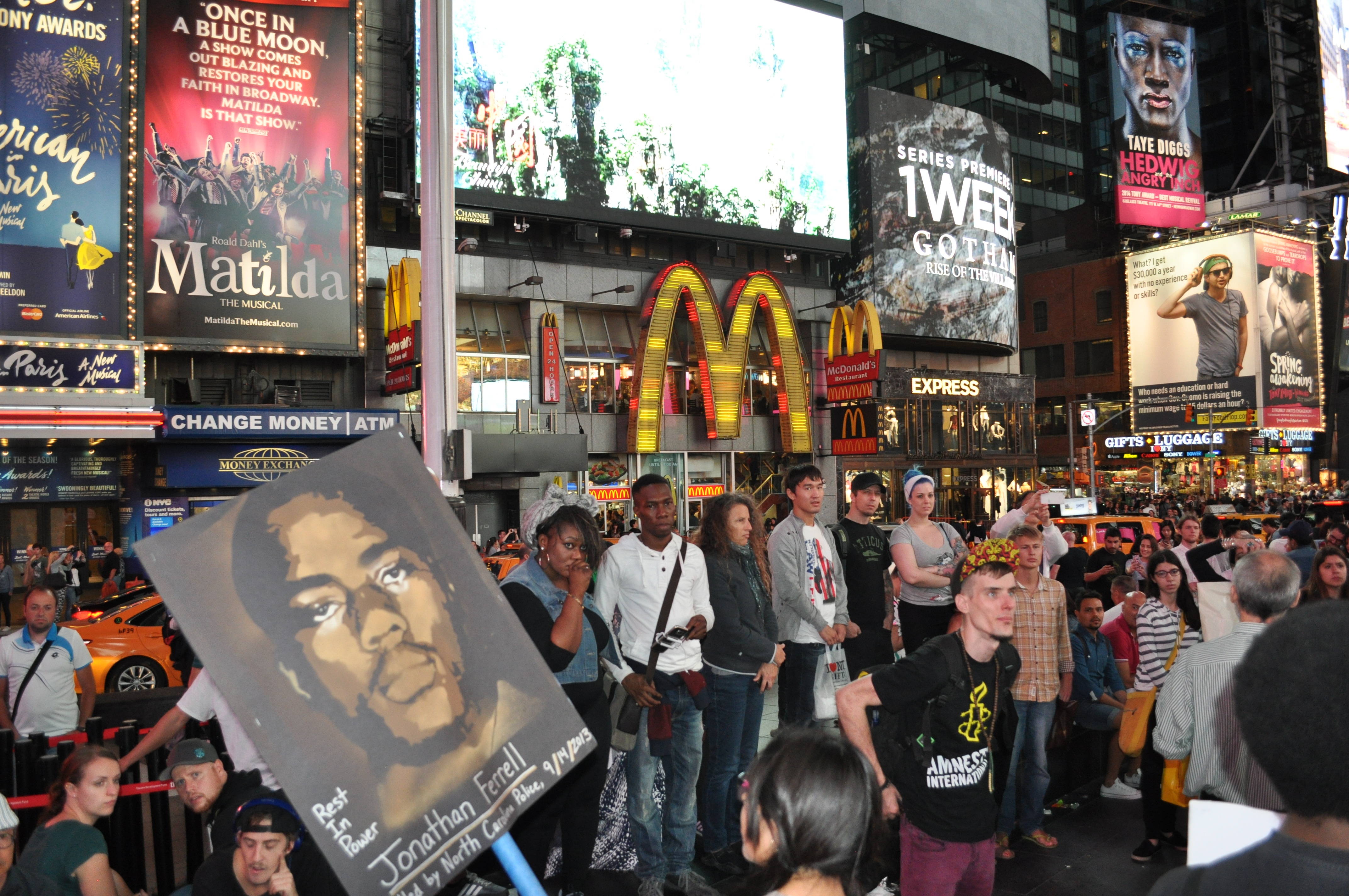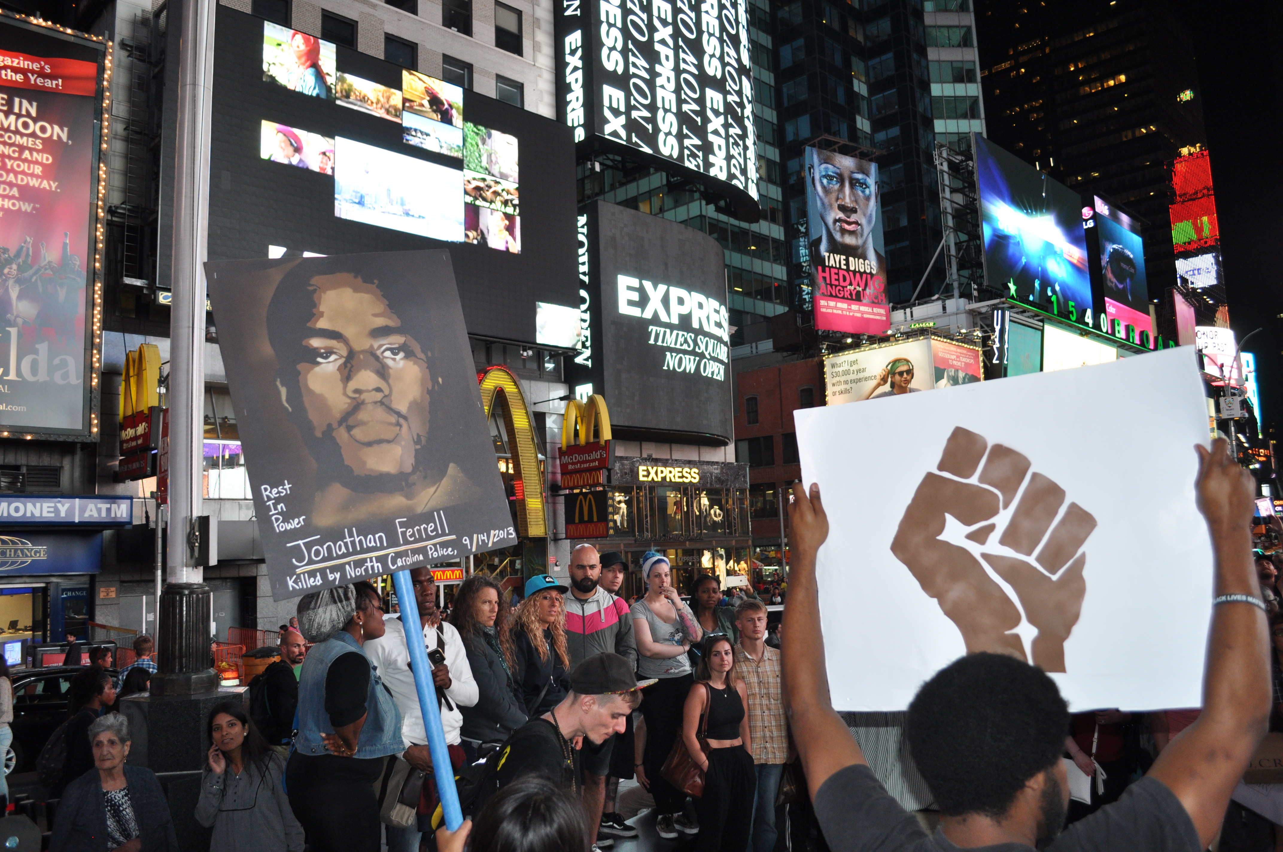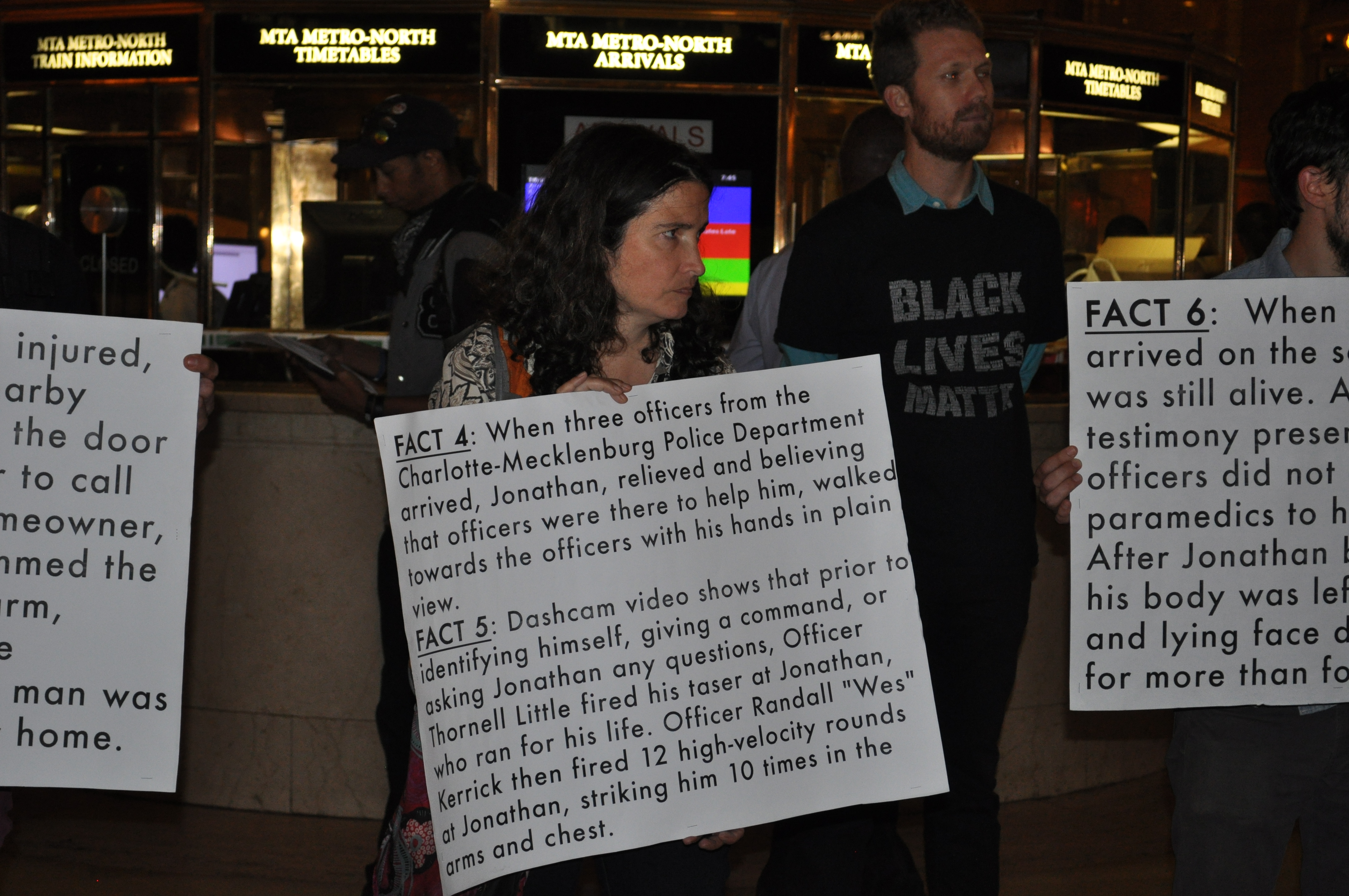 Last week I went to my first Peoples Monday, a weekly Call to Action with Black Lives Matter NYC and Shut It Down NYC. The photos in this post are from last week’s event for Jonathan Ferrell. He was murdered by cops in North Carolina two years ago. You can learn more about his story here and from the Fact Cards below, made by a woman who was present at the recent trial.