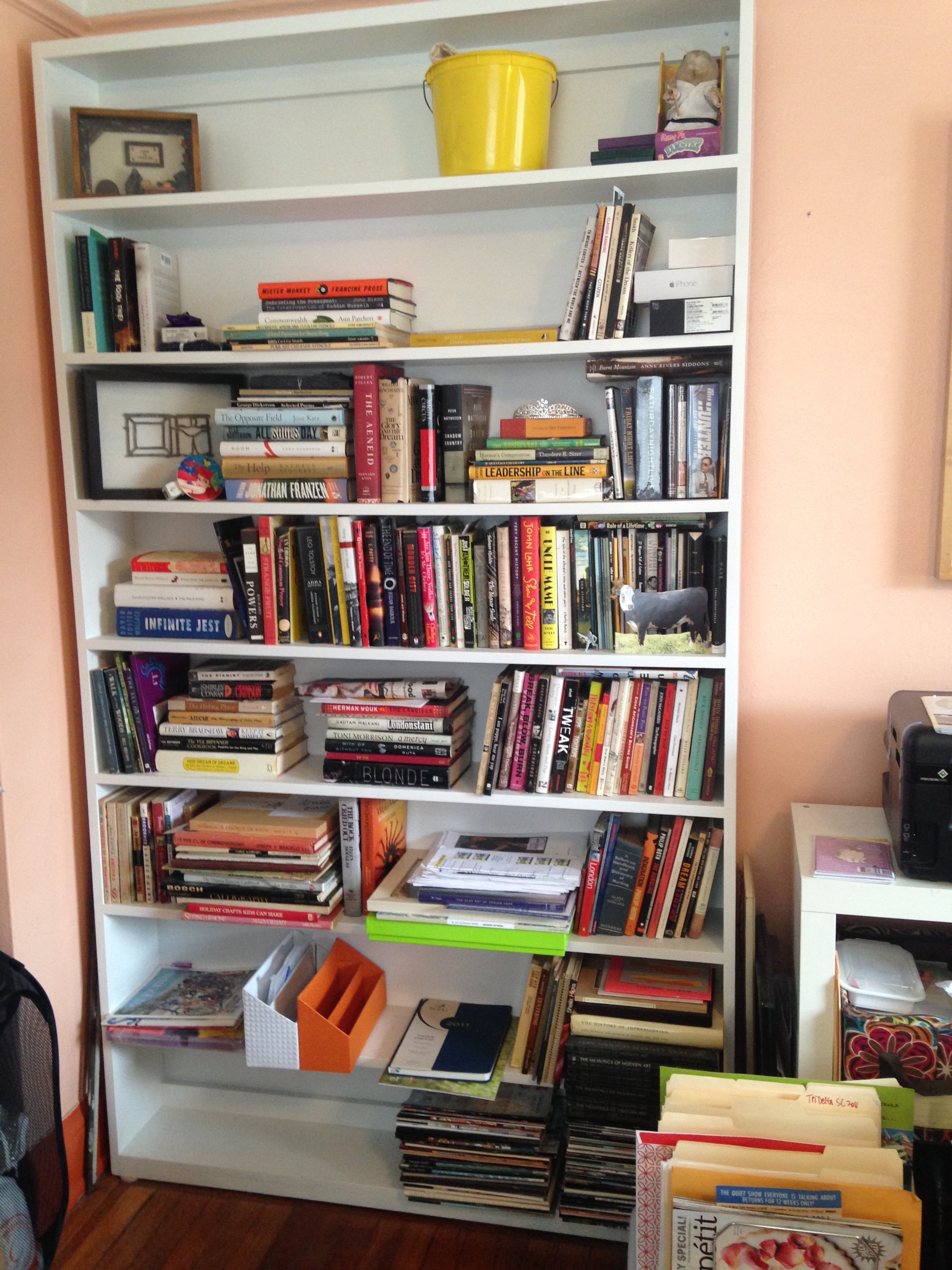 - Weed out the books you don’t need. Personally, I am ruthless when it comes to getting rid of things — books, clothes, tchotchkes. This comes from years of practice and my personal strivings to live a flowing, feng shui sort of a life. But many people don’t share my love and ease with that whole out-with-the-old thing. So here’s a good place to start: If you have no association with the book (can’t remember why you even have it in the first place) and/or cannot see yourself ever actually reading it, put it in the sell or donate bin and give it away. If you think you’ll have trouble making a split decision, have an extra “maybe” bin and commit to weeding out 50% of your “maybes” when you can give it more thought.